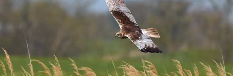 Talented acrobats of the skies, the Marsh Harriers are a protected species, at one time rare but strengthening in numbers beyond East Anglia, to other areas of the UK. With their distinctive V-shaped wing profile – sometimes spanning over a metre - they glide effortlessly above the reed beds, whipping gracefully across the skies as they search for prey along the marshes. They come to breed in April and leave in October to winter in the warmer African climes. The males show off their fabulous aerobatic skills in an attempt to woo the females during breeding season; rotating at great heights then diving in a series of dramatic tumbles; sometimes locking talons with a female mid-air.