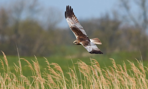 Talented acrobats of the skies, the Marsh Harriers are a protected species, at one time rare but strengthening in numbers beyond East Anglia, to other areas of the UK. With their distinctive V-shaped wing profile – sometimes spanning over a metre - they glide effortlessly above the reed beds, whipping gracefully across the skies as they search for prey along the marshes. They come to breed in April and leave in October to winter in the warmer African climes. The males show off their fabulous aerobatic skills in an attempt to woo the females during breeding season; rotating at great heights then diving in a series of dramatic tumbles; sometimes locking talons with a female mid-air.