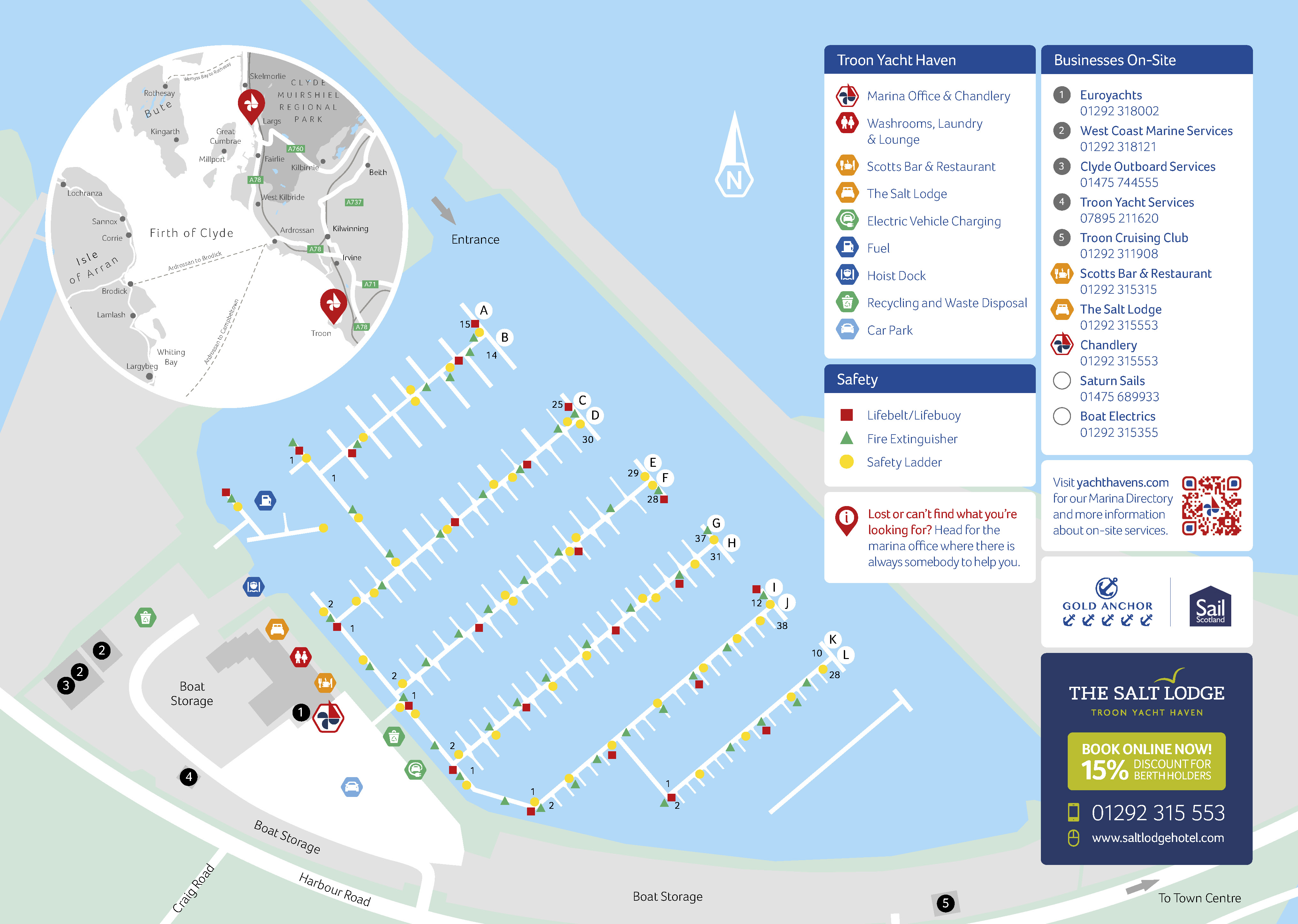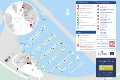 A well-stocked chandlery is on-site, open 7 days a week. Morrisons supermarket and cash points can be found in nearby Troon town.